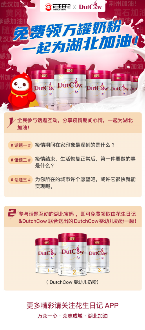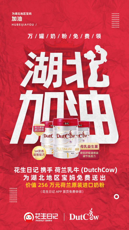 获悉这一情况后,花生日记迅速携手国际知名奶粉品牌荷兰乳牛(DutchCow)发起“万罐奶粉免费领”活动,既让湖北地区宝宝尽快喝上优质的奶粉,也让湖北宝妈们对抗击本次疫情更有信心。