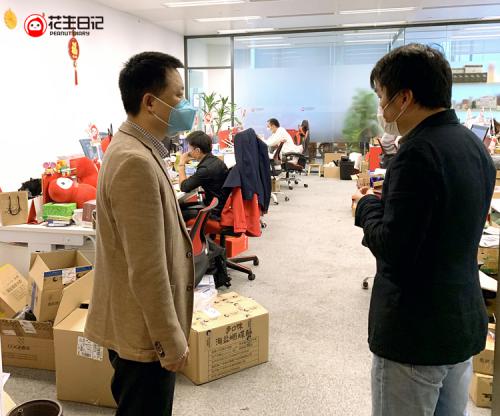 3 月 2 日 , 琶洲管委会主任、琶洲集聚区党委书记郭明富 , 琶洲管委会干部曾瑜莅临花生日记公司 , 了解复工复产情况 , 给予亲切关怀和悉心指导 , 并充分肯定了花生日记的复工防疫工作。