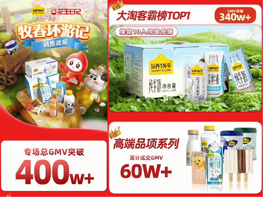 在活动短短的3天内,花生日记携手认养一头牛共同创造了400W的GMV,单品霸榜大淘客单品top1,高端品项系列突破60w+。卓越的成绩不仅彰显了双方合作的强大实力,更凸显了花生用户对认养一头牛高品质乳制品的热烈追捧。