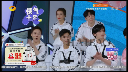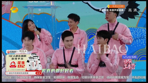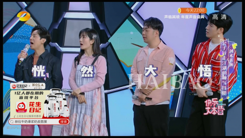 在智能大屏直播中,花生日记在节目画面中与快乐家族、6名男神同框,与大家一起分享观看《快乐大本营》的快乐。