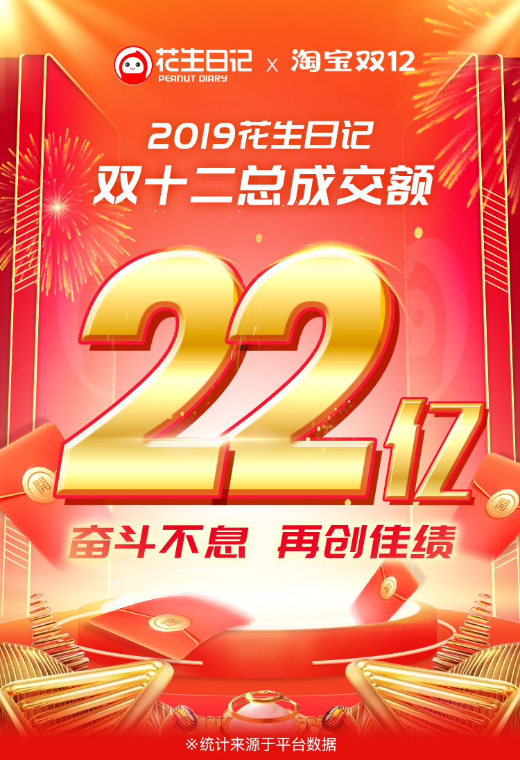 在刚过去的2019年双12,花生日记总交易额达到22亿元,是2018年双12交易额的2倍多。在双12淘宝推广活动中,花生日记一直以领跑者姿态,“霸占”榜首位置。